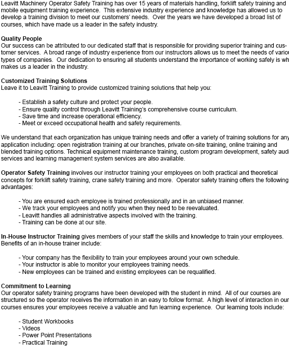 The large range of start times and programs we provide should make certain that you find the perfect match for your needs. Whether you are searching for someone to come teach at your place of work or would prefer to train at our facility, we can accomodate all your needs. Our experienced team can tailor our training to your specific equipment at your location of business.